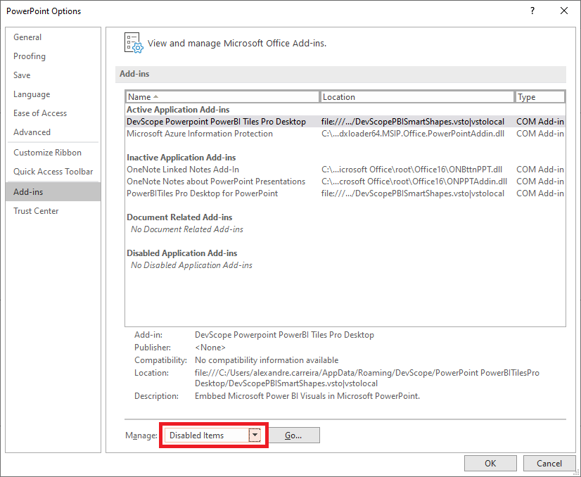 If you don't see the tab of PowerBI Tiles Tab in PowerPoint you may need to activate the Add-in by following the steps below.