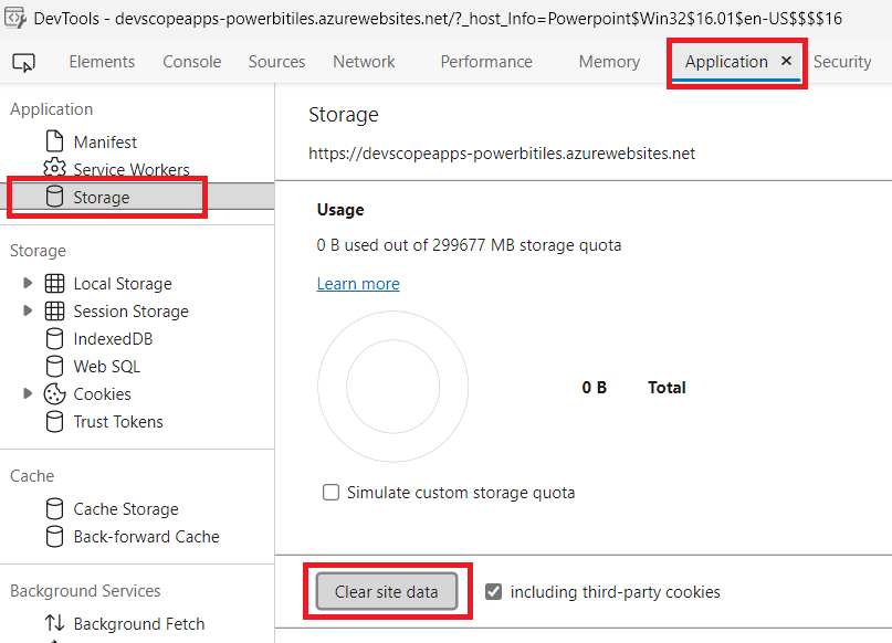 A new screen show appears. Please go to Application Tab, choose Storage, and click on "Clear site data" to clear the add-in cache in the PowerPoint.