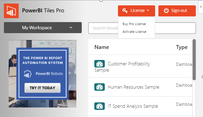 - To activate the license of PBI Tiles Online open the solution, click on Store, then click on Activate License as shown below: